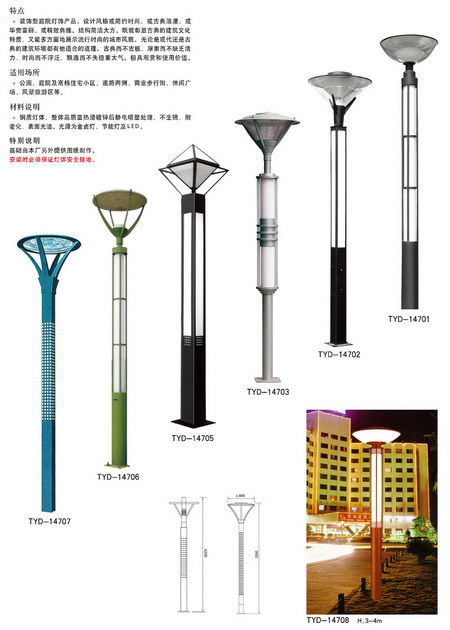 庭院燈是戶外照明燈具的一種,通常是指6米以下的戶外道路照明燈具,其主要部件由:光源、燈具、燈桿、法蘭盤、基礎(chǔ)預(yù)埋件5部分組成,因為庭院燈其具有多樣性、美觀性具有美化和裝飾環(huán)境的特點(diǎn),所以也被稱之為景觀庭院燈。主要應(yīng)用于城市慢車道、窄車道、居民小區(qū)、旅游景區(qū),公園、廣場等公共場所的室外照明,能夠延長人們的戶外活動的時間,提高財產(chǎn)的安全。
